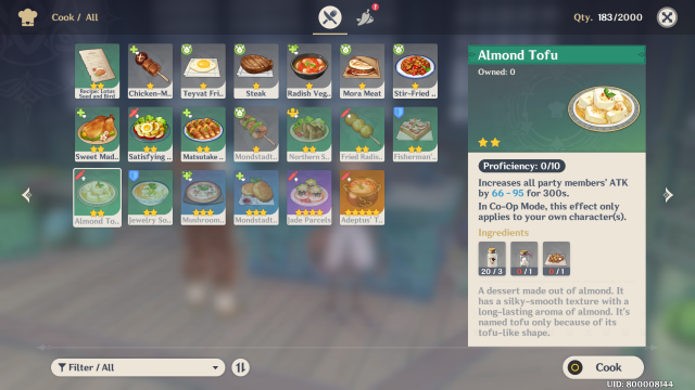 As a roleplaying game, Genshin Impact offers a wide variety of cooking recipes, ingredients, items, etc – that helps the players throughout their journey. The cooking items generally provide different types of buffs, special status, and are quite often used to gain HP or Stamina. Similarly, the Almond Tofu in Genshin Impact is a food item that provides ATK buff to all party members.