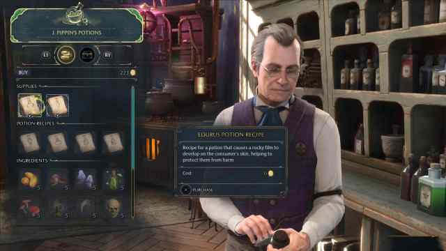 In Hogwarts Legacy, you can get the Edurus Potion by purchasing it from Parry Pippin at the J. Pippin’s Potion shop in Hogsmeade. Each unit costs 300 Gold.