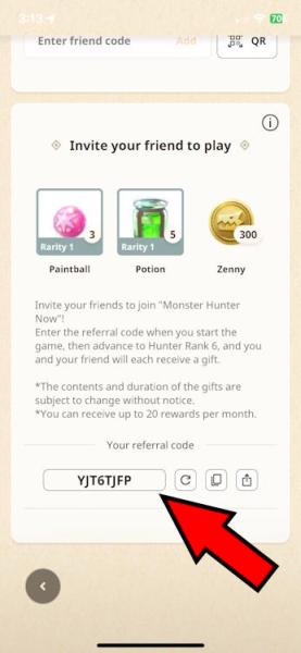 You can also generate your own Referral Code to give out to other players who are looking to start Monster Hunter Now. This works the same way, as once a player who uses your code reaches HR 6, both of you get the rewards.