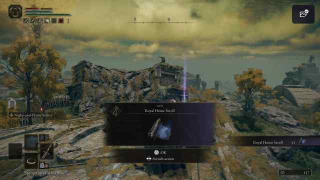 The Royal House Scroll is atop a broken structure on a dead body beside a royal mage enemy. Teleport to the Agheel Lake South Site of Grace, make your way to the southeast—heading to the top of the cliff. Check the below map screenshot to reach the scroll’s exact location.