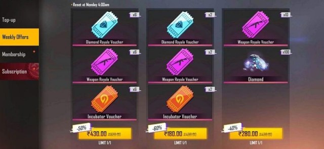 Weekly Offers combines incubator, diamond royale and weapon skin vouchers, diamonds, and more at a discounted price.