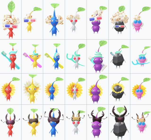 The decor they wear depends on where the Pikmin seedling was first discovered. For example: if the Pikmin Seedling was found at a park, then the Pikmin will wear a Clover Decor, or if the Pikmin was found near a bakery, it will wear a piece of baguette.