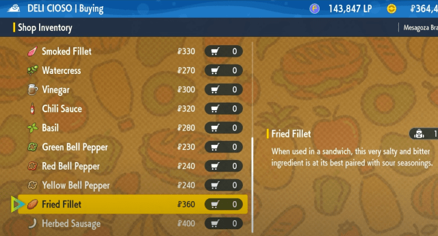 You must obtain at least four Gym Badge to unlock the Fried Fillet at the Deli Cioso. Once you fulfill this requirement, the ingredient will get added to the shop listing. And from there, you can navigate the menu and buy Fried Fillet for 380 Pokedollars.
