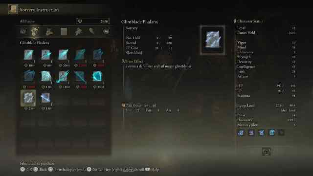 It requires an Intelligence of 22 to use the Glintblade Phalanx sorcery, and it consumes a decent 20 FP and 12 Stamina. You can use the Glintblade Phalanx sorcery with other attacks to deal combined damage or catch your enemies off guard.