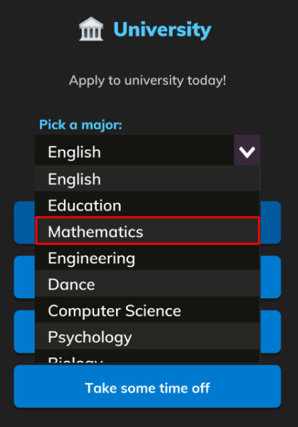 You will graduate from the university after a couple of years. After graduation, you will get a pop-up that asks if you would like to seek higher education. Click it, choose Business School from the list and apply for a scholarship once again. If you didn’t get the initial pop-up, you can check under the Education tab.