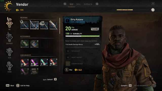 You can talk to the Vendor and purchase the Katana. In case you don’t have 542 Gold to get the Katana, you can sell valuables in your inventory. They fetch a great price.