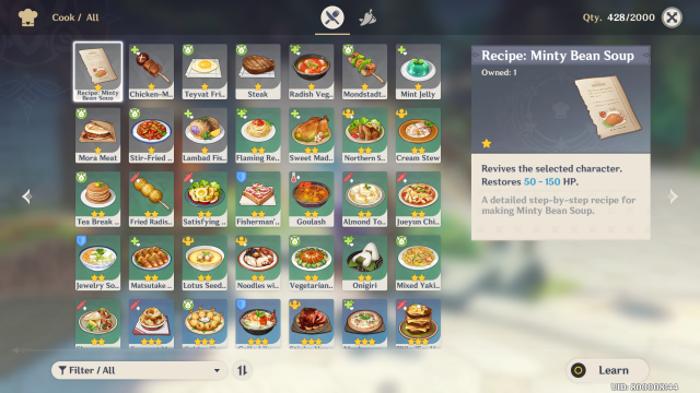 To learn the Minty Bean Soup recipe in Genshin Impact, players must go to a cooking station or use the Stove gadget to enter the Cooking Menu. Once done, players will get the option to learn the Minty Bean Soup recipe in the Cooking Menu. Select the recipe and click on the Learn button.