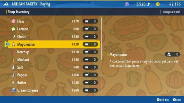 Once you arrive at the Artisan Bakery at Mesagoza, interact with the NPC to access the shop items. After that, navigate through the list of things to find Onion. Then press the A button on your Switch and buy the item using Pokedollars.