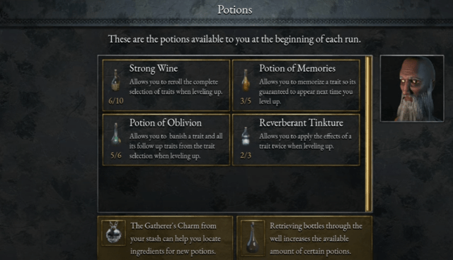 In other words, potions are consumable items in Halls of Torment that players can use to reroll traits, memorize traits to guarantee their appearance in the next level up, banish a trait, and apply the effects of a trait twice.