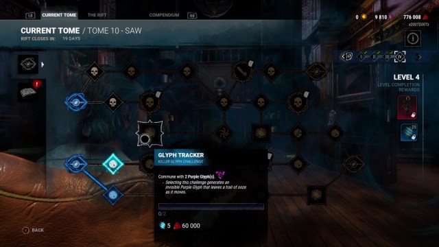The purple glyph is a Killer-only challenge found in a tome. To accept the challenge players must visit the Tomes, first completing any challenges that lead to the one you want. Sometimes the challenge asks to just find one purple glyph, and other times it requires two glyphs to be found in two matches. Once the challenge is complete, players are rewarded with Bloodpoints and Rift Fragments which help them level up.