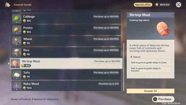 You can get Shrimp Meat by buying them from different vendors found in Genshin Impact, like Aoi, the General Goods Shop owner located in Inazuma City. Aoi sells 100 units of Shrimp Meat, each costing around 120 Mora. Aoi’s stock refreshes in 24 hours. So, you can stock as much Shrimp Meat you want over a few weeks.