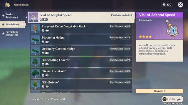 Players can buy around five Vials of Adeptal Speed from Serenitea Pot companion Tubby.