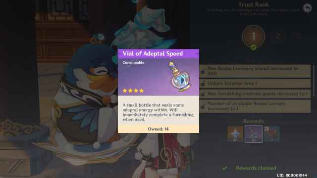 The second way to get Vial of Adeptal Speed is by increasing the Trust Rank by placing more furnishings, indoor and outdoor units. Up to Rank 4, players will get ten vial of adeptal speed, each time they rank up.