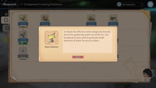 Buying water from Water World is fine, but it quickly burns a hole in your pocket if you don’t supplement it with your own water gathering. Thankfully, one of the blueprints you can learn at Qi’s research center is the Dew Collector, which requires 8 Data Discs to unlock. Prioritize this early on, since you need as much water as you can get.