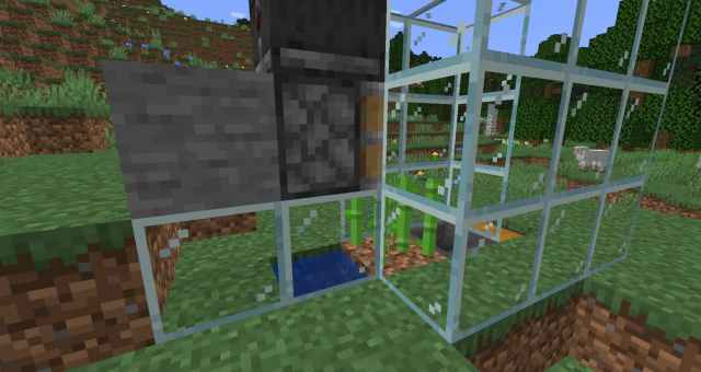 Lastly, surround the farm with glass or other buildings to prevent sugar cane from flying outside. When the observer detects that the sugar cane has grown completely, it will activate the piston. All the broken sugar cane pieces will get collected into the chest.
