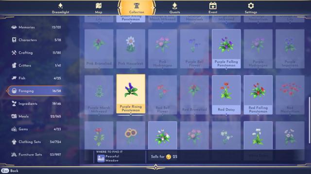 Just wander around the Plaza and Peaceful Meadow, and you should come across a bunch of random flowers. You’re bound to find the Purple Penstemons after a couple trips around. If you’re not having much luck, just go explore another area for a while and let the Plaza and Peaceful Meadow respawn items.