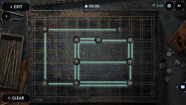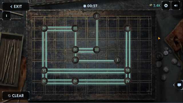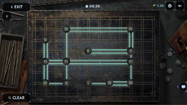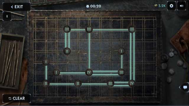 Like the Codebreaker and Lockbox puzzles, the Hashi puzzles in Silent Hill: Ascension follow a relatively simple principle: You get a board with various coins on it. Each coin has a Roman numeral (I, II, III, IV instead of 1, 2, 3, 4), indicating how many connections the coin may have. Your goal is to draw lines between coins until each is connected the exact number of times indicated by its Roman numeral.