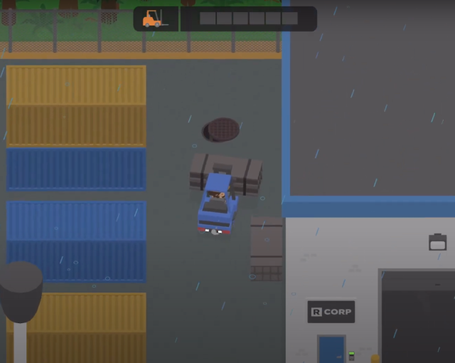 14. Still staying clear of all people and not getting caught, drive the forklift into the storage facility