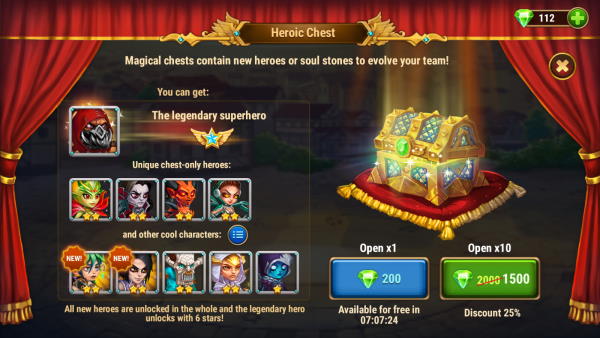 You can open one heroic chest per day for free. After that, you can pay 200 emeralds to open one chest or 2,000 for ten chests. Right now there is a 25% discount on the 10-chest pull, so it brings it to 1,500 emeralds.