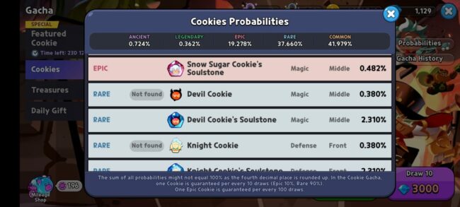 As the Devil Cookie is rare, the chances of drawing it are 0.380%. For its soul stone, the chances are 2.310%. Overall, the rare cookies have a 37.660% of being drawn, so you’re bound to get the Devil Cookie someday.
