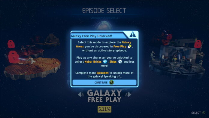 The Galaxy Free Play mode will become available to you after you’ve completed at least one of the nine Star Wars Episodes. When you first start off the game, you can only access Episode I, IV or VII, which are the starting points of any of the three sagas from the acclaimed Star Wars movies.
