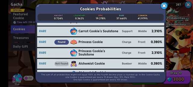 The noble Princess Cookie comes under the Rare Cookie category. You’ll have to draw from the regular Gacha using 300 crystals or Cookie Cutters. Rare Cookies have a 37.660% chance of being drawn.