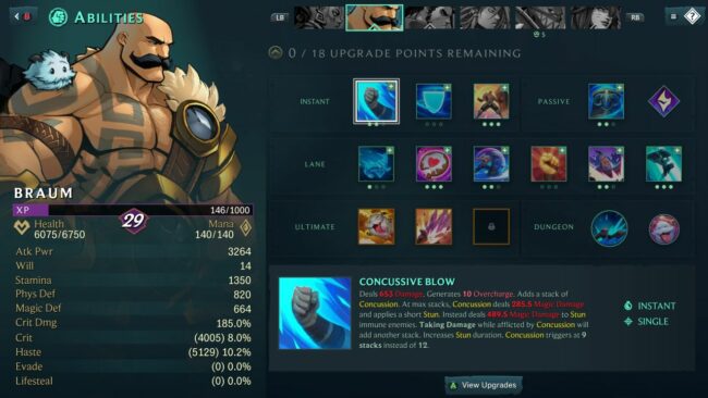 | Concussive Blow (Instant) | Deals light damage, generates 10 Overcharge. Adds a stack of Concussion. Taking damage while afflicted by Concussion will add another stack. At max stacks, Concussion deals 74.2 Magic Damage and applies a short Stun. |