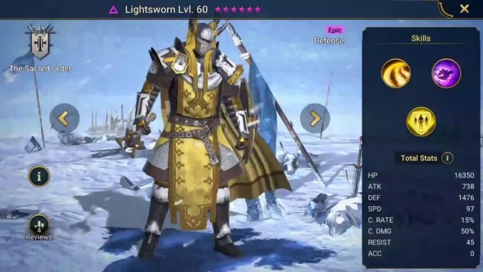Lightsworn is a Void epic from the Sacred Order faction. He has a great mixture of debuffs to slow and decrease the damage of his enemies and buffs to protect his team.