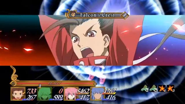 Equip the Material Blade on Lloyd. You don’t need the Eternal Swordsman title equipped, you just have to own it. During battle, be in critical health (Lloyd’s HP counter will be red), then press and hold your Arte, guard, and attack buttons all at the same time to activate Falcon’s Crest, a powerful area attack.