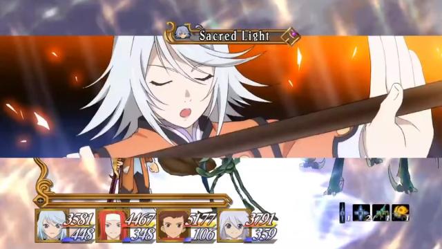 For Sacred Light, Raine must cast Ray or Holy Lance at least 100 times. Cast either spell while Rain is in Over Limit, and she will cast Sacred Light instead, a holy spell that attacks all enemies on the field.