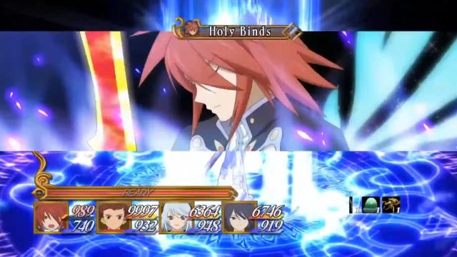 Kratos’ Mystic Arte, Holy Binds, has an intriguing requirement: Lloyd must not be equipped with the Material Blade, or he must not participate in the battle at all.