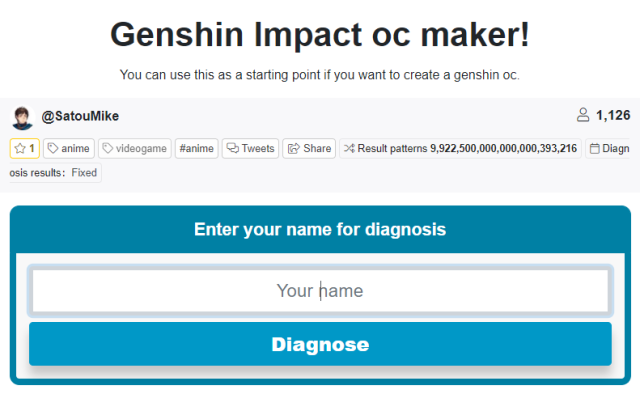 Once you are on Shindanmaker’s Genshin Impact OC Maker page, you will get the option to enter your name. Do that and click on Diagnose to get details on which type of Original Character you are, based on your name.