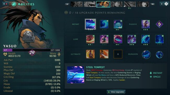 Yasuo, like mentioned above, is an offense-oriented character, and one of the game’s most powerful Champions. He specializes in dealing huge amounts of damage to both single and multiple targets, thanks to abilities like Sweeping Blade, Gathering Storm, and Raging Wind. The latter two can also be used without any mana or Overcharge cost by stacking Steel Tempest, which grants free use of either ability once it has reached maximum amount.