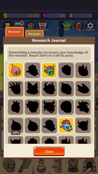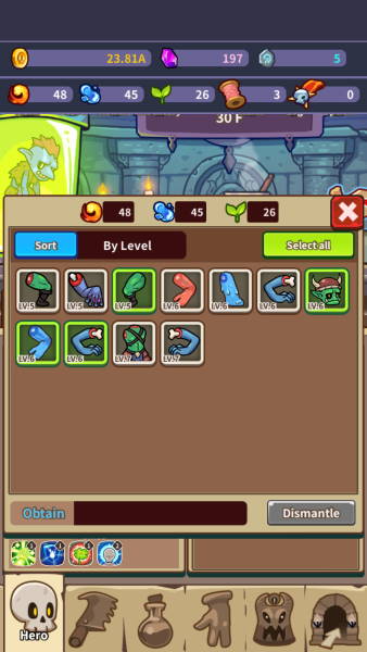 Dismantling can be through through the “Hero” tab. Any monster parts that you don’t want or are outdated you can dismantle to receive elemental essences. These essences are used in a variety of processes, including mixing new potions and crafting new parts, so you should dismantle as much as possible!
