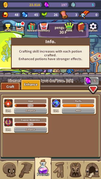 You have to brew potions before you can use them, and brewing them costs essences. As you progress through the dungeon and level up, you’ll unlock new potions to brew. Potions can also be upgraded to increase their potency, and you do this by brewing the same kind of potion over and over again. Once you’ve brewed enough of them, the potion will level up and become stronger.
