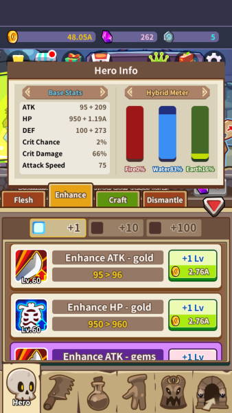 Your warrior’s current element is determined by the monster parts you are using. If you go into the Hero tab and the Enhance tab, you can see your current elemental make up under the hybrid meter. Let’s say you’re mostly fire, with a little bit of water and no earth – you’ll take increased damage from water attacks and slightly more damage from earth attacks.