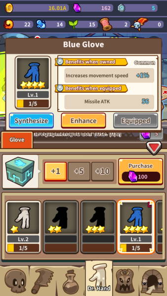 Enhancing a glove increases tap damage during a dungeon run, but each glove also comes with a passive bonus that helps out as well. You don’t even need to equip the glove for it to take effect either – you just need to own it. For example, some gloves increase your attack power while others increase your movement speed.