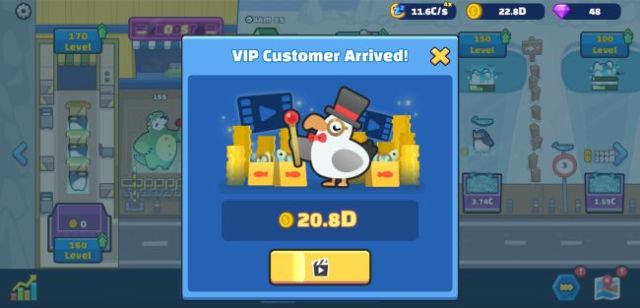 This is basically an offer for you to watch a video ad and receive a bunch of coins in return. This is based on your current stage in the game, so you will always get a really nice amount of money for watching the ad. Take advantage of this when you need just a bit more for your next set of upgrades!