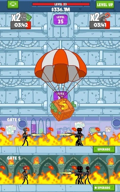Each gate can be upgrade using cash. Upgrading a gate increases the time it spends enraged and the amount of money the gate generates. Always be constantly upgrading your gates, as it is the main form of progression and power. The faster you take out evil stickmen, the more money you can get!