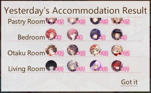 – The partners you place in the Living Room will give a bonus to EXP output, up to maximum 60%.