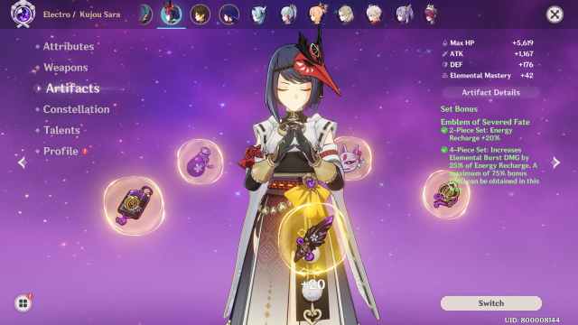When building Kujou Sara, Genshin Impact players should look for Crit Rate, Crit DMG, ATK% and Energy Recharge in the sub stats. Kujou Sara, with proper artifacts and weapons, is an excellent teammate for Electro teams.