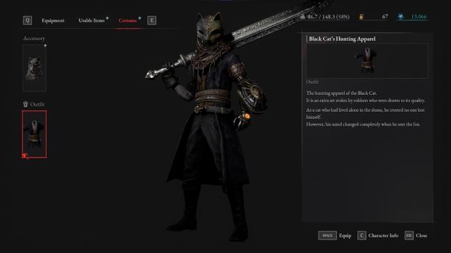 For the mask, you’ll need to make your way to the top of Arche Abbey Outer Wall to confront Black Cat himself. You can make peace with him by giving him a Gold Coin Fruit, or you can end things on a bloody note. Either way, the mask is yours.