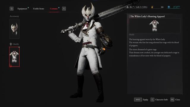 At the Rosa Isabelle Street Entrance, you’ll find a curious stage set up. Approach it to start a fight with the White Lady mini-boss. Defeat her to get her mask accessory.