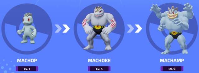 Machamp starts the match out as Machop at level 1. Machop evolves into Machoke at level 5, then finally Machamp at level 9.