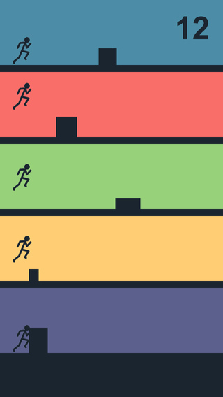 However, unlike No One Dies Today, you can’t use the full screen swipe technique. That is, swiping down through the whole screen to make all your stick figures jump in quick succession. It was a useful technique for clearing obstacles that were way too close to each other. In Make Them Jump swiping doesn’t work, you must tap on each individual box to make that corresponding stick guy jump. This is kind of detrimental as the higher difficulties often like to throw obstacles at multiple stick men in almost the same exact position, but I’ve figured out another trick. Your iDevice is capable of registering up to three separate taps on the screen, so use three fingers to make multiple stick men jump at the same time!