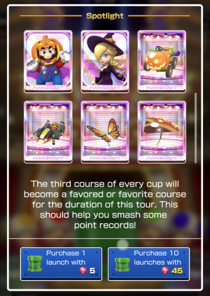 The spotlight also brings the chance to get Pumpkin Kart with Mini Turbo Boost, and Crawly Kart with Slipstream Plus. Butterfly Sunset and Chocolate Banana Crepe gliders also feature. Each gacha pull of the pipe costs 5 rubies, or 10 pulls for 45 rubies.