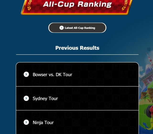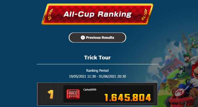 Mario Kart Tour leaderboards webpage shows the current cup rakings and the previous results. Players can view the top-ranking players, check their names and score.