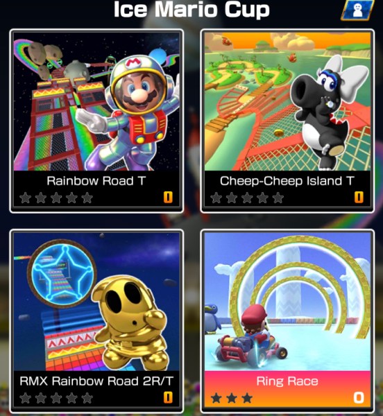The Space Tour begins with four new tracks in The Ice Mario Cup: Rainbow Road T, Cheep-Cheep Island T, RMX Rainbow Road 2R/T, and the bonus track Ring Race. Beat your opponents on these tracks to earn Grand Stars and unlock levels in the Tour Gifts.