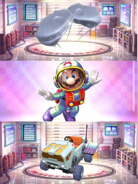 In the Green Pipe during the Mario Kart Space Tour there is a chance to win Mario (Satellaview), the Lunar Cruiser kart, and the Meteor Balloons glider. The appearance rates for these high-end items in the gacha pipe is 1.0204%, and there is only one of each available for each player.