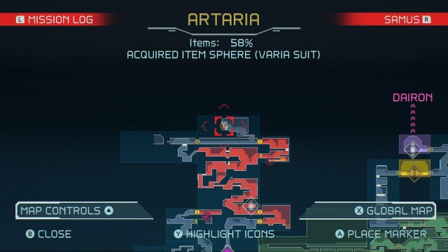The Varia Suit is found in Artaria, in the location shown on the map above. This area can be accessed after defeating the Green E.M.M.I. and obtaining the Morph Ball upgrade in Cataris, follow the narrow pathways to reach a Red Teleportal to Artaria, and proceed until you find the Chozo Statue holding the Varia Suit.